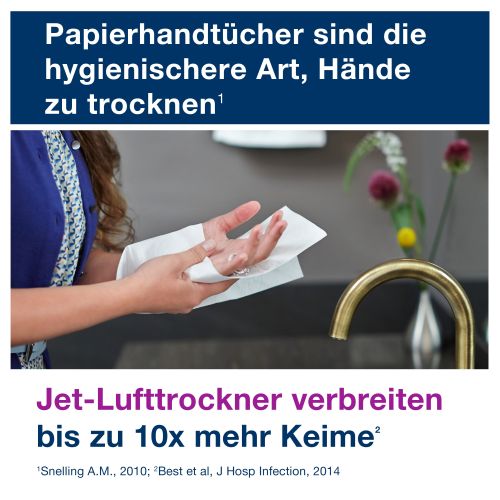 * QuickDry – unser stärkstes und saugfähigstes Papier, das ein effizienteres Abtrocknen bei geringerer Abfallmengeermöglicht